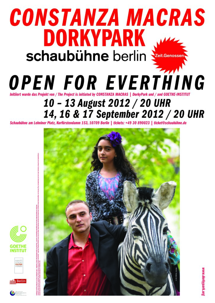 Open for Everything” is a journey through the stagnant lives of Europe’s Roma communities in misery. Roma exist in the public perception mainly as a problem: as impoverished, criminal “gypsies” unwilling to integrate. At the same time, the exoticising myth of the travelling people conceals the catastrophic living conditions of the marginalised and persecuted ethnic minority. Constanza Macras nevertheless takes up the motif of travelling and confronts the experiences of flight and migration of the Roma with the occupational nomadism of the dancers of the DorkyPark company. The production is being developed with 17 Roma musicians, dancers and amateurs of different ages from Slovakia, Hungary and the Czech Republic, as well as with five dancers from the company Constanza Macras | DorkyPark, who come from Israel, Germany, the Netherlands, Canada and South Korea.